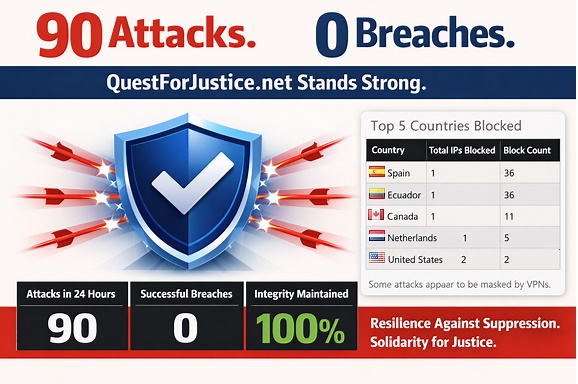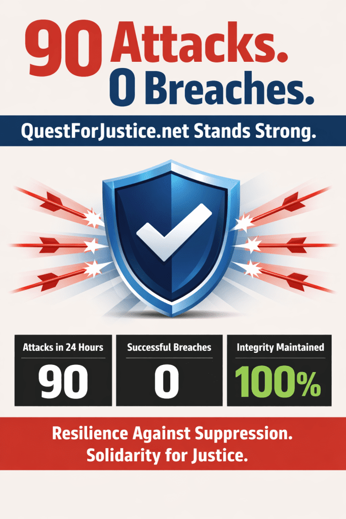 In the recent time QuestForJustice.net has endured daily between 80 and 97 coordinated cyberattacks from what we know to be well-known adversaries. Only in the past 24 hours, QuestForJustice.net has endured 90 of these coordinated cyberattacks Every single attempt failed. This outcome demonstrates the resilience of our systems and the determination behind our mission. Despite persistent efforts to silence or undermine our advocacy, our infrastructure remains uncompromised. These attacks are proof of the lengths some will go to suppress transparency and accountability. Their failure is evidence of the strength of collective vigilance and ethical systems. QuestForJustice.net continues to document institutional wrongdoing and mobilize public solidarity. The failed attacks underscore the urgency of our work and the importance of protecting platforms that stand for justice.