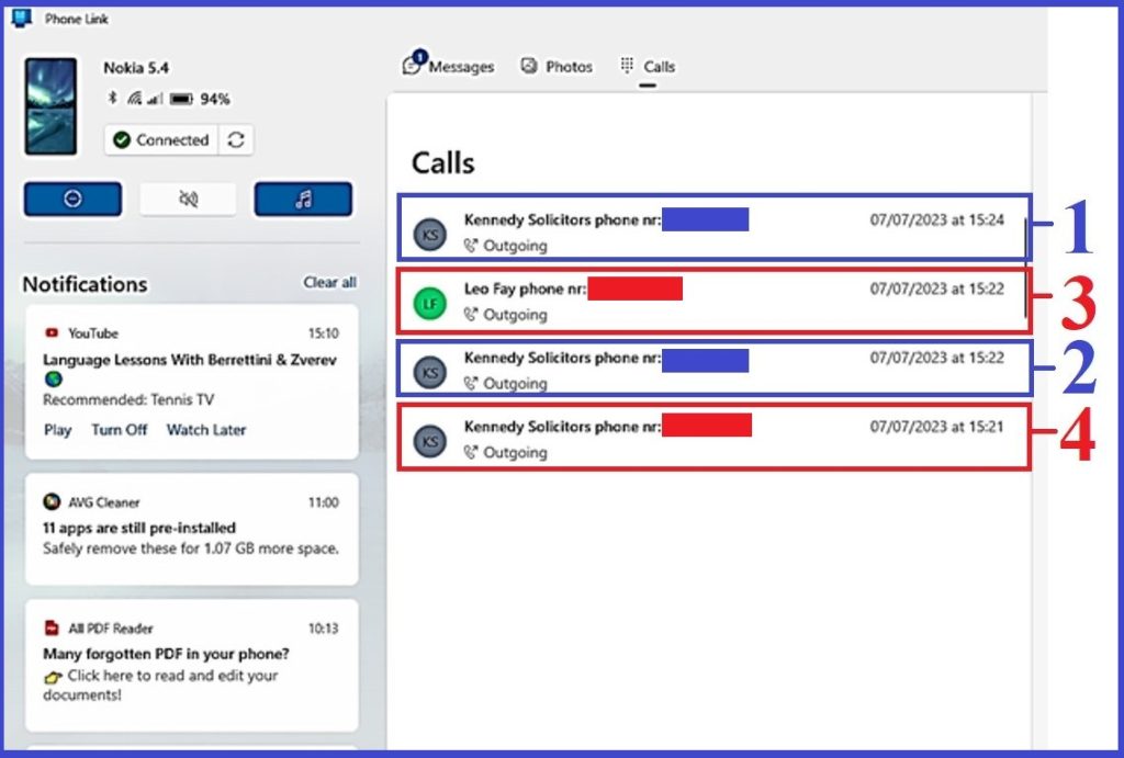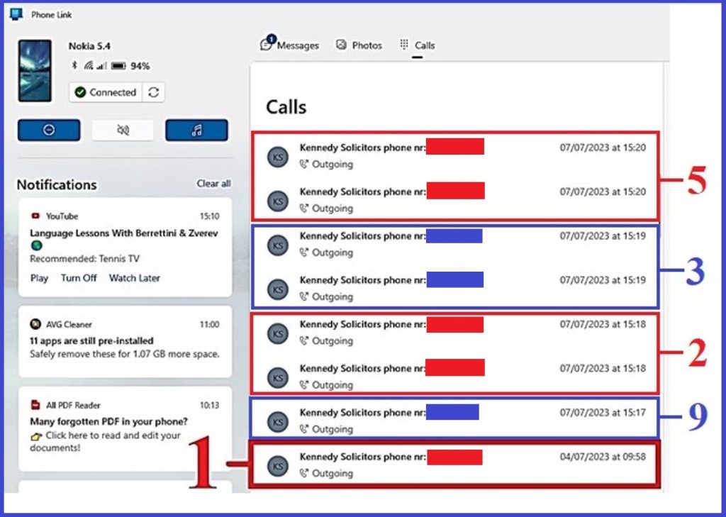 Having in mind the talk on 4th July 2023 (see nr 1…appendix phone call) in which Mr Leo Fay of Michael J. Kennedy Solicitors invited the victim to phone him on Friday 7th July, we point to the unsuccessful attempts of the victim to reach criminal Leo Fay on that day as follows: